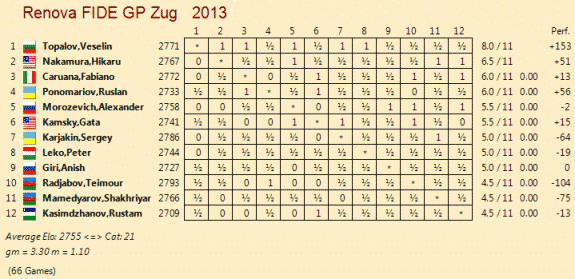 Haz click para agrandar. Cuando todos creíamos que ya había iniciado una lenta pero consistente cuesta abajo en su carrera ajedrecística, el GM Búlgaro Topalov ha ganado de forma muy convincente el GP De la FIDE en Zug, con 5 victorias y 6 tablas, y con ello cosecha una subida de 22 puntos de elo, lo que le catapulta al 4º puesto de la clasificación ((2793). Buen torneo también de Nakamura, que sólo perdió contra Topalov. Os dejo con su victoria en la última ronda, la única partida con victoria de la última ronda. [pgn][Event "Renova FIDE GP Zug"] [site "Zug SUI"] [Date "2013.04.30"] [Round "11.3"] [White "Topalov, Veselin"] [black "Karjakin, Sergey"] [Result "1-0"] [ECO "A64"] [WhiteElo "2771"] [blackElo "2786"] [PlyCount "81"] [EventDate "2013.04.18"] 1. d4 Nf6 2. c4 e6 3. g3 c5 4. d5 exd5 5. cxd5 d6 6. Nc3 g6 7. Bg2 Bg7 8. Nf3 O-O 9. O-O Re8 10. Nd2 Nbd7 11. a4 a6 12. a5 b5 13. axb6 Nxb6 14. Nb3 Bf5 15. Na5 Ne4 16. Bd2 Nxd2 17. Qxd2 h5 18. e3 h4 19. Rfe1 Qg5 20. Na4 Reb8 21. Nc3 Qh5 22. f3 Qh8 23. g4 Bd7 24. h3 f5 25. g5 f4 26. exf4 Bd4+ 27. Kh1 Qg7 28. Bf1 Re8 29. Ne4 Kh8 30. Nxd6 Rxe1 31. Rxe1 Rf8 32. Re4 Nxd5 33. Nb3 Bc6 34. f5 gxf5 35. Rxh4+ Kg8 36. Nxd4 cxd4 37. Bc4 Qe5 38. Qxd4 Qxd6 39. Rh6 Qe7 40. Bxd5+ Bxd5 41. Rh8+ 1-0 [/pgn]